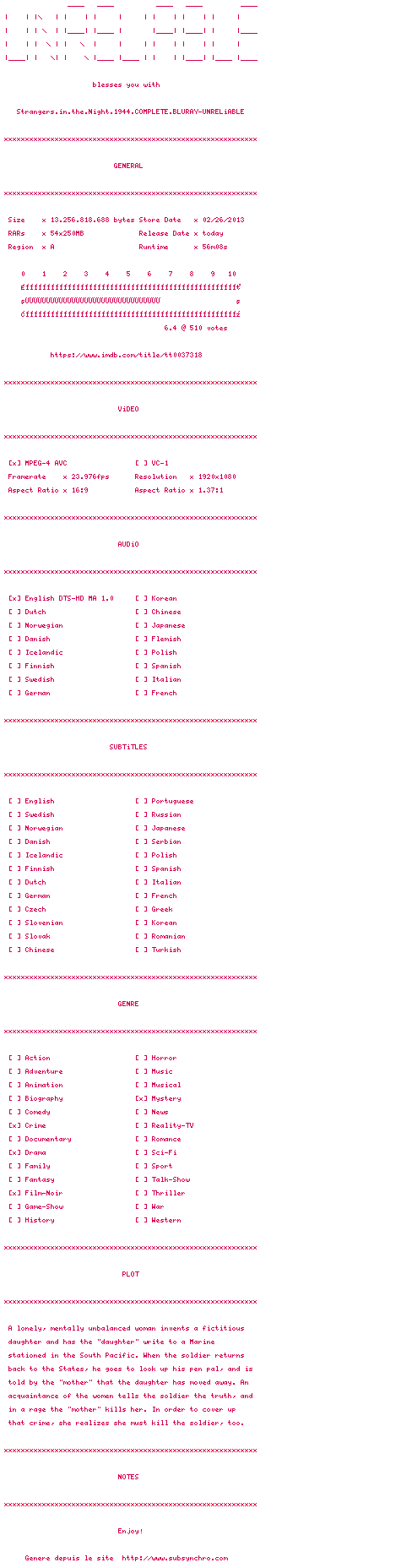 Voir le nfo de la release Strangers.In.The.Night.1944.COMPLETE.BLURAY-UNRELiABLE