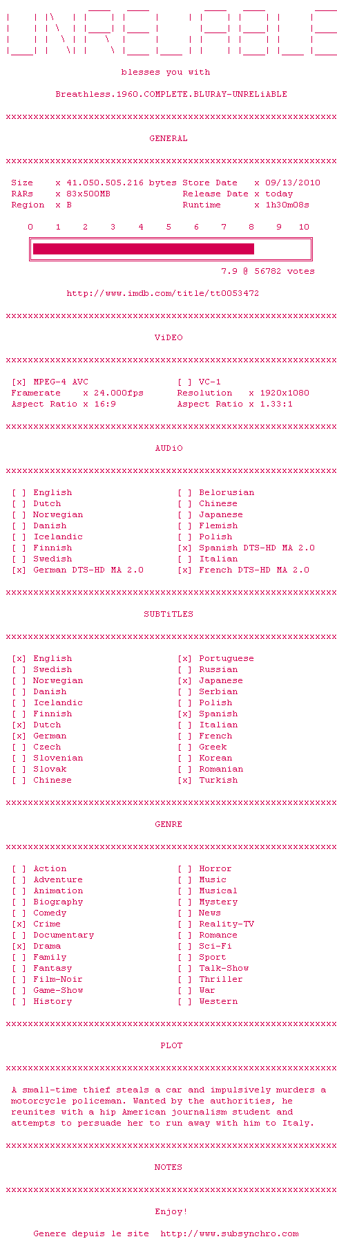 Voir le nfo de la release Breathless.1960.COMPLETE.BLURAY-UNRELiABLE