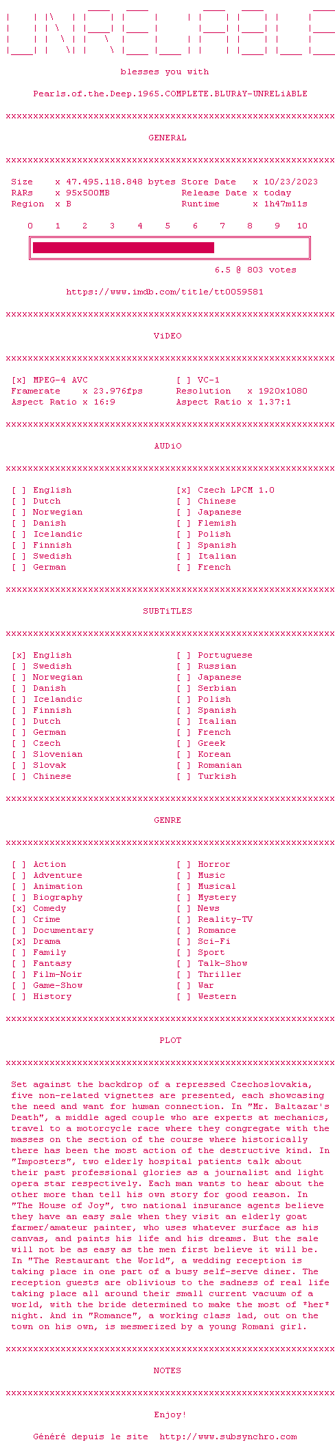 Voir le nfo de la release Pearls.Of.The.Deep.1965.COMPLETE.BLURAY-UNRELiABLE
