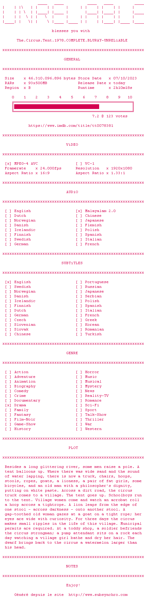 Voir le nfo de la release The.Circus.Tent.1978.COMPLETE.BLURAY-UNRELiABLE