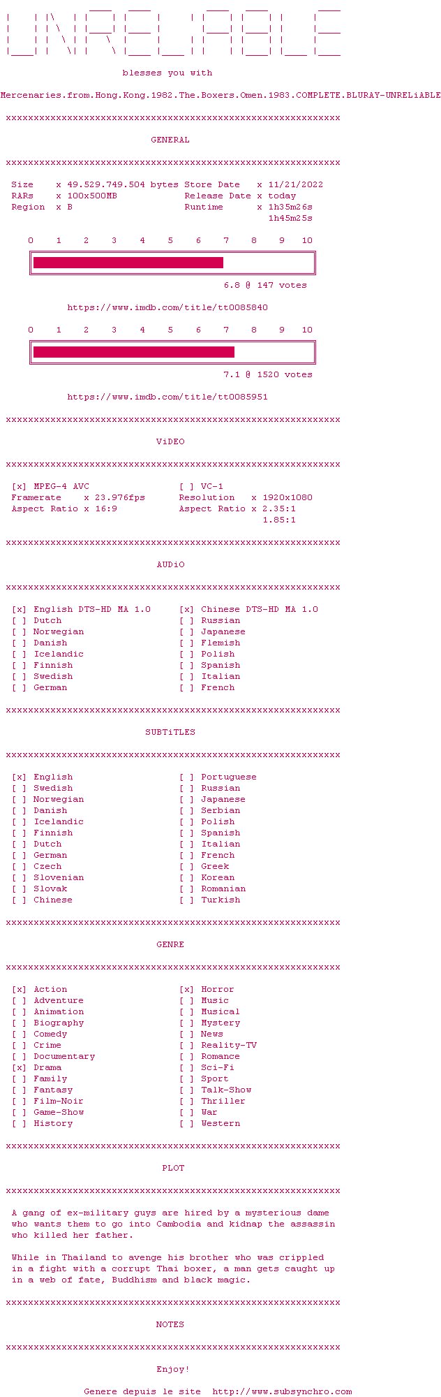 Voir le nfo de la release Mercenaries.From.Hong.Kong.1982.The.Boxers.Omen.1983.COMPLETE.BLURAY-UNRELiABLE