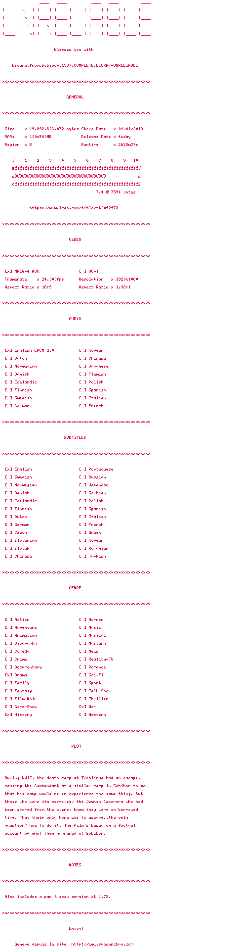 Voir le nfo de la release Escape.From.Sobibor.1987.COMPLETE.BLURAY-UNRELiABLE