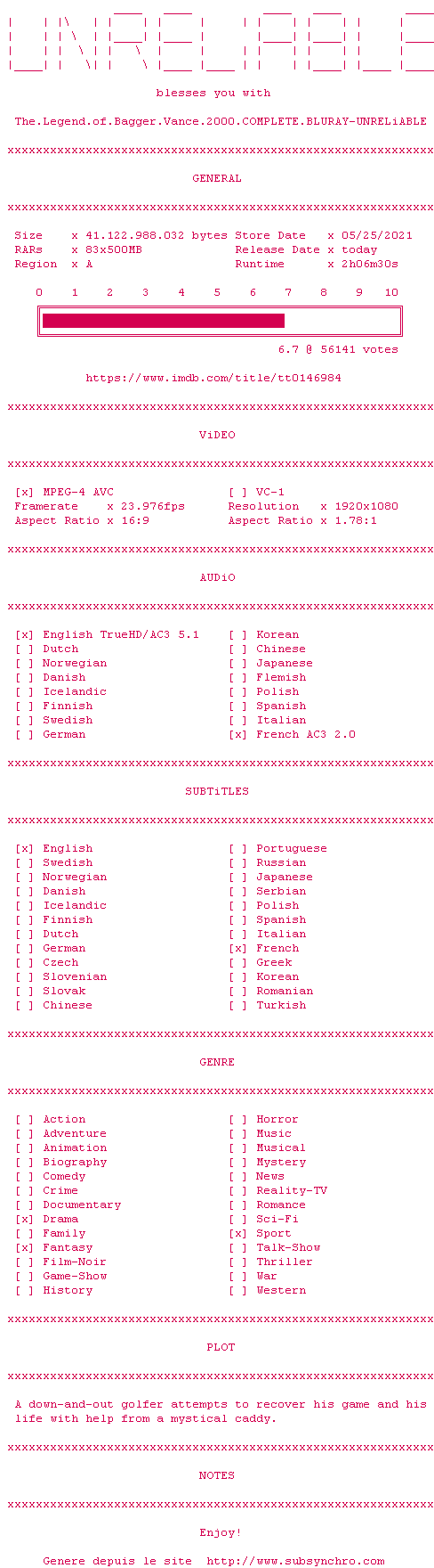 Voir le nfo de la release The.Legend.Of.Bagger.Vance.2000.COMPLETE.BLURAY-UNRELiABLE