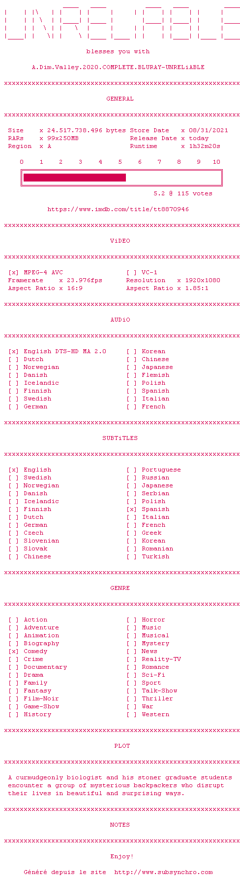 Voir le nfo de la release A.Dim.Valley.2020.COMPLETE.BLURAY-UNRELiABLE