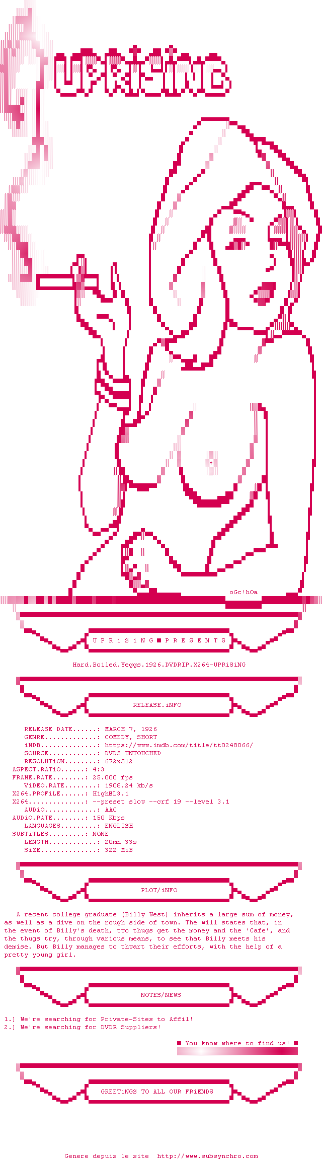 Voir le nfo de la release Hard.Boiled.Yeggs.1926.DVDRIP.x264-UPRiSiNG