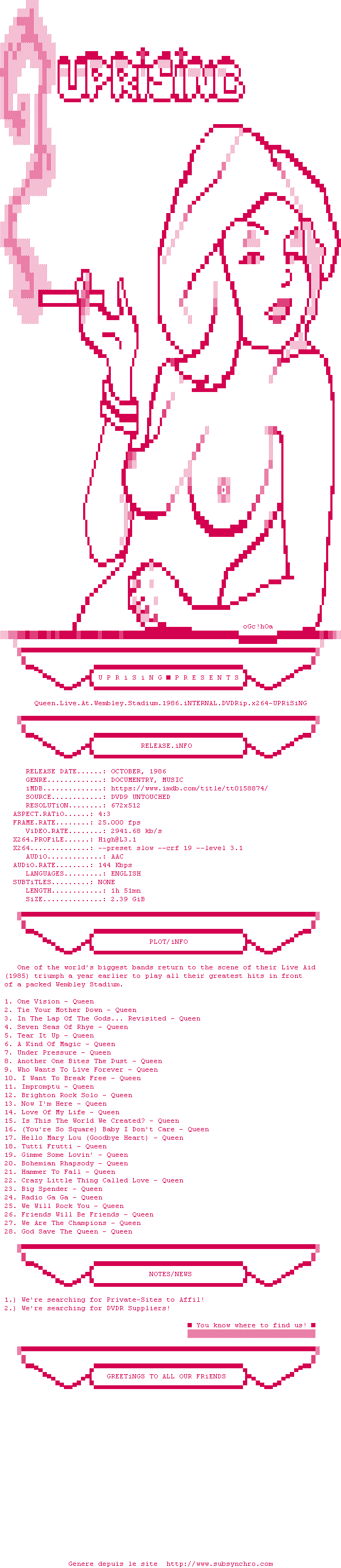 Voir le nfo de la release Queen.Live.At.Wembley.Stadium.1986.iNTERNAL.DVDRip.x264-UPRiSiNG