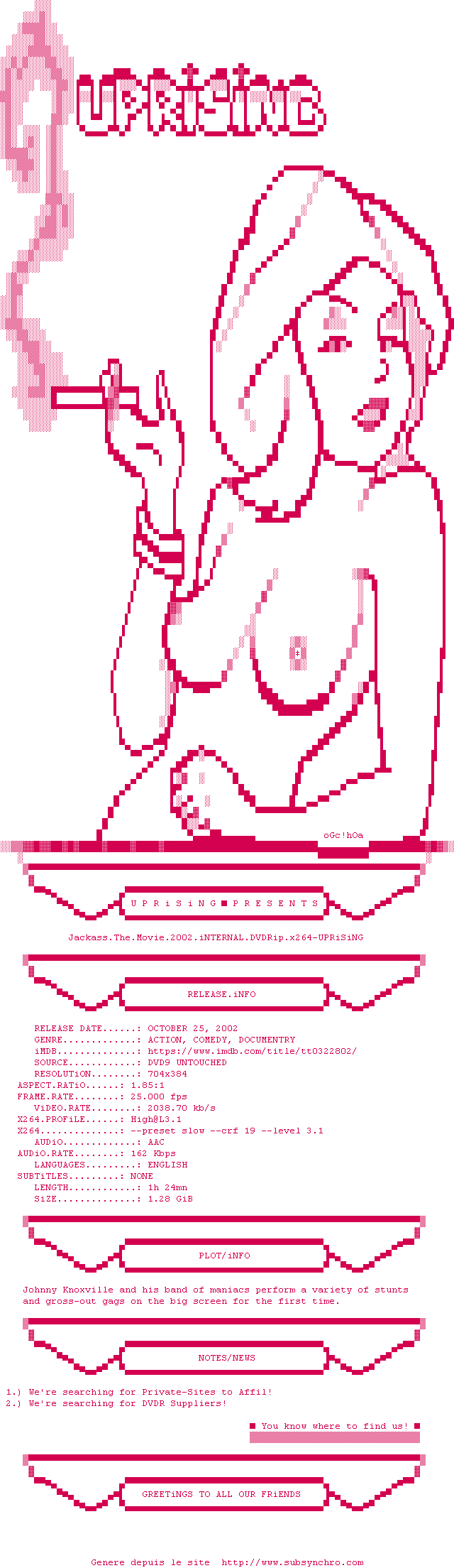 Voir le nfo de la release Jackass.The.Movie.2002.iNTERNAL.DVDRip.x264-UPRiSiNG
