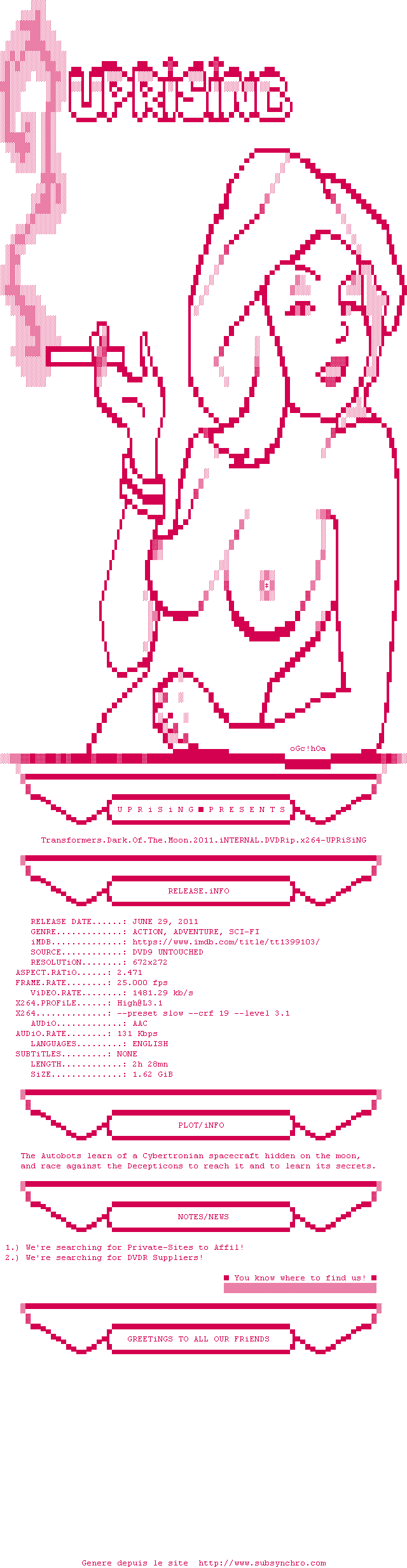 Voir le nfo de la release Transformers.Dark.Of.The.Moon.2011.iNTERNAL.DVDRip.x264-UPRiSiNG
