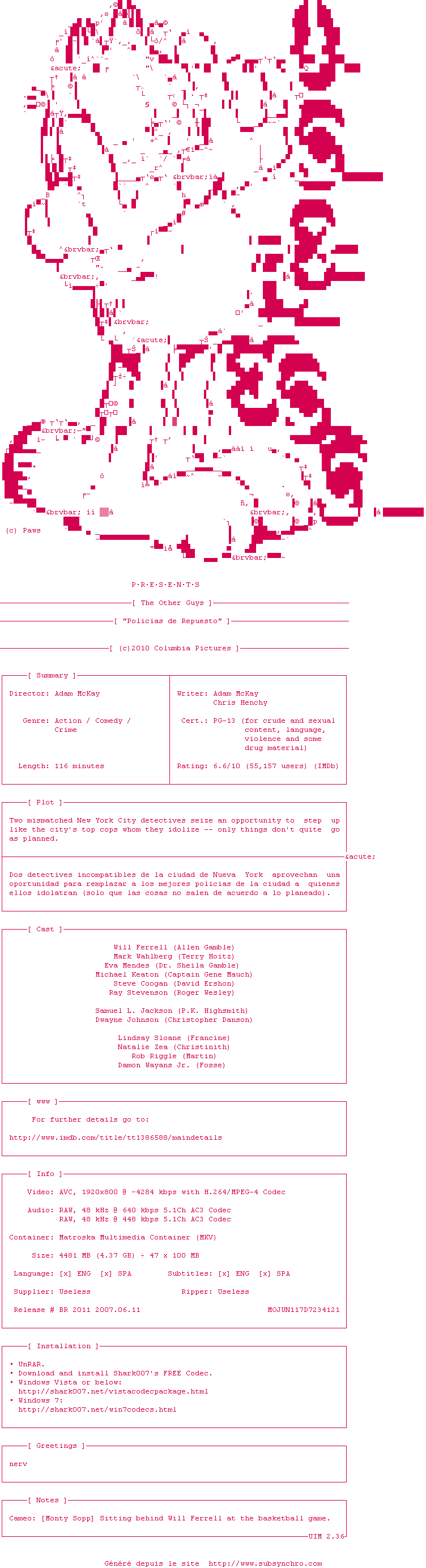 Voir le nfo de la release The.Other.Guys.UNRATED.VERSION.BDRip.x264.2010-USL