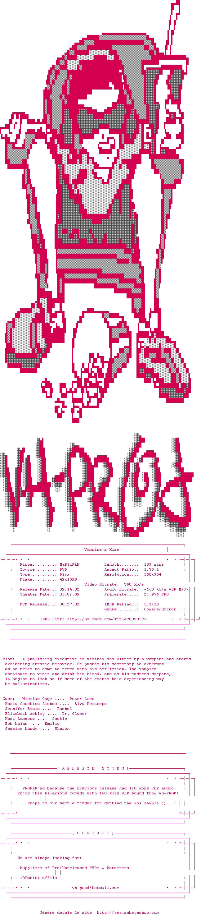 Voir le nfo de la release Vampires.Kiss.1989.PROPER.DVDRip.DivX-VH-PROD