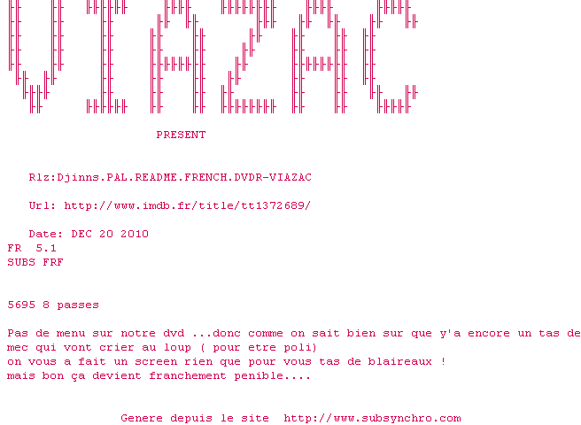 Voir le nfo de la release Djinns.PAL.README.FRENCH.DVDR-VIAZAC