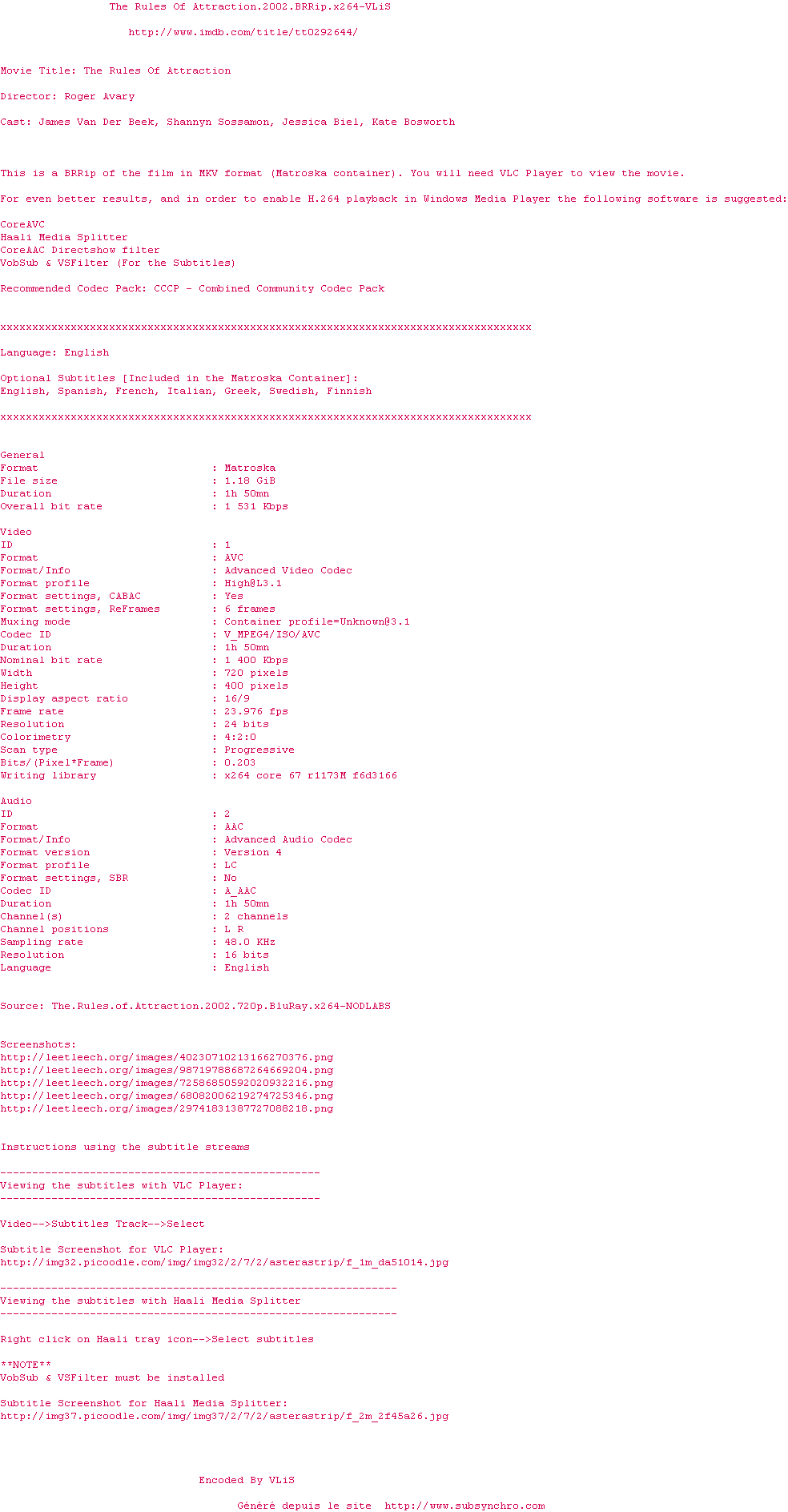 Voir le nfo de la release The.Rules.Of.Attraction.2002.BRRip.x264-VLiS