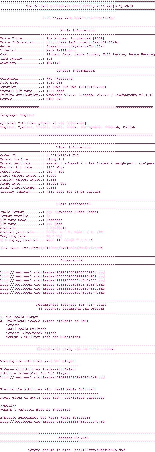 Voir le nfo de la release The.Mothman.Prophecies.2002.DVDRip.x264.AAC-VLiS