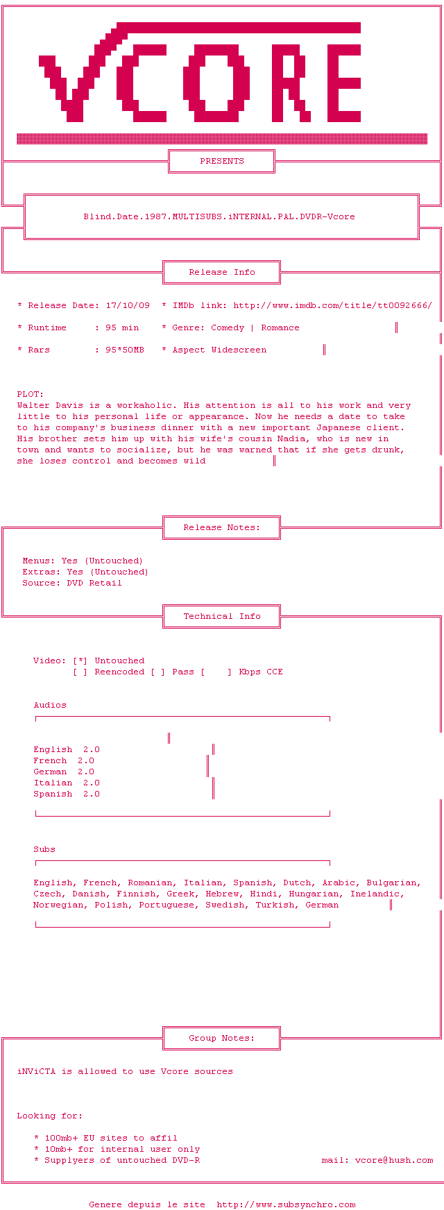 Voir le nfo de la release Blind.Date.1987.MULTISUBS.iNTERNAL.PAL.DVDR-Vcore