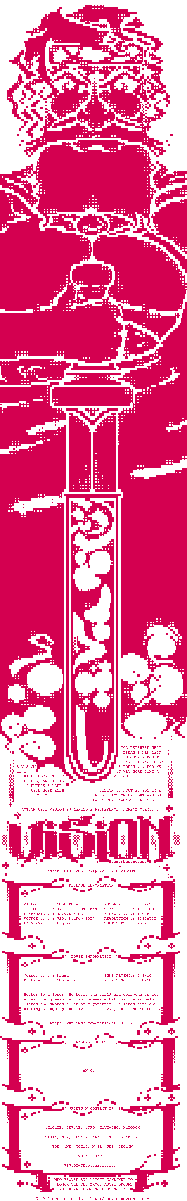 Voir le nfo de la release Hesher.2010.720p.BRRip.x264.AAC-ViSiON