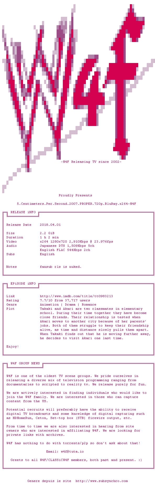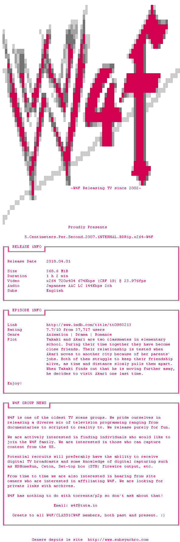Voir le nfo de la release 5.Centimeters.Per.Second.2007.iNTERNAL.BDRip.x264-W4F