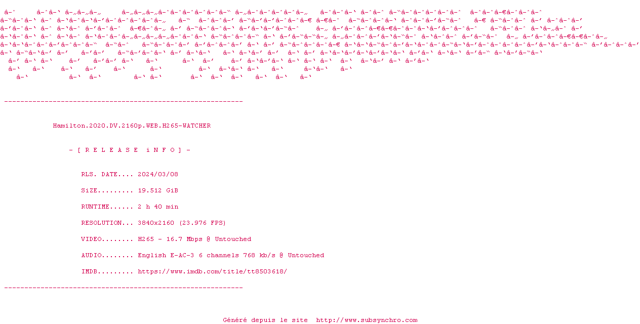 Voir le nfo de la release Hamilton.2020.DV.2160p.WEB.H265-WATCHER