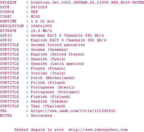 Voir le nfo de la release Downtown.Owl.2023.GERMAN.DL.2160P.WEB.H265-WAYNE