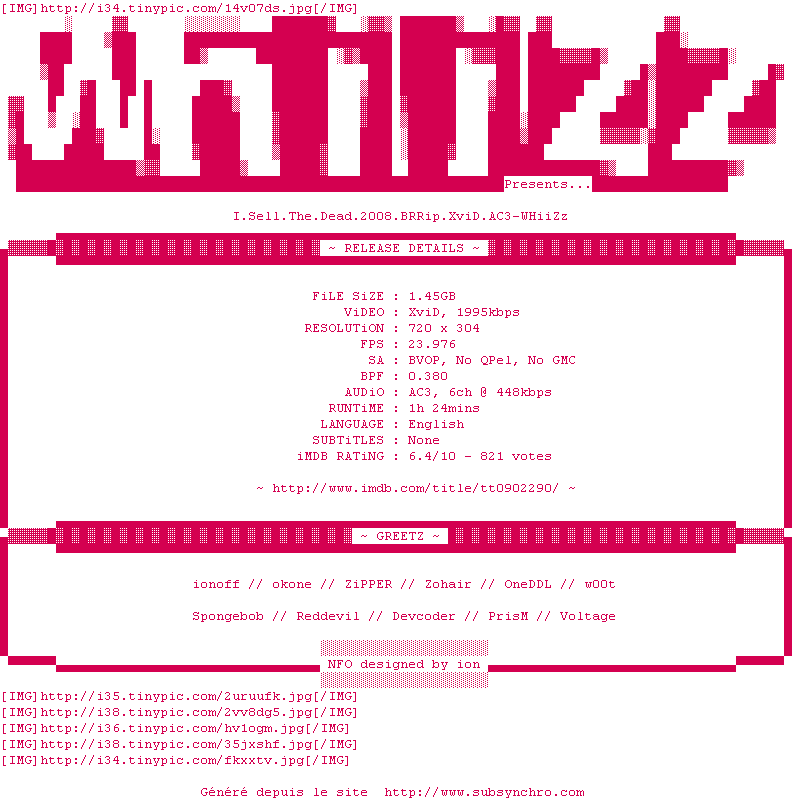 Voir le nfo de la release I.Sell.The.Dead.2008.BRRip.XviD.AC3-WHiiZz