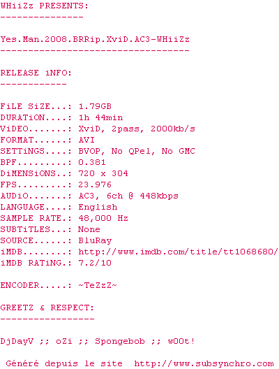 Voir le nfo de la release Yes.Man.2008.BRRip.XviD.AC3-WHiiZz