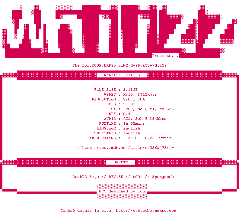 Voir le nfo de la release The.Box.2009.BRRip.LiNE.XviD.AC3-WHiiZz