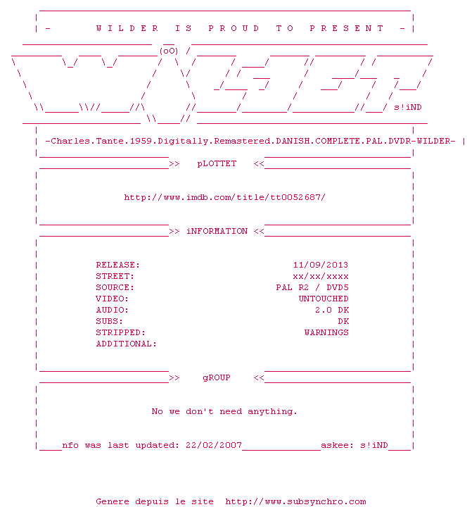 Voir le nfo de la release Charles.Tante.1959.Digitally.Remastered.DANISH.COMPLETE.PAL.DVDR-WILDER