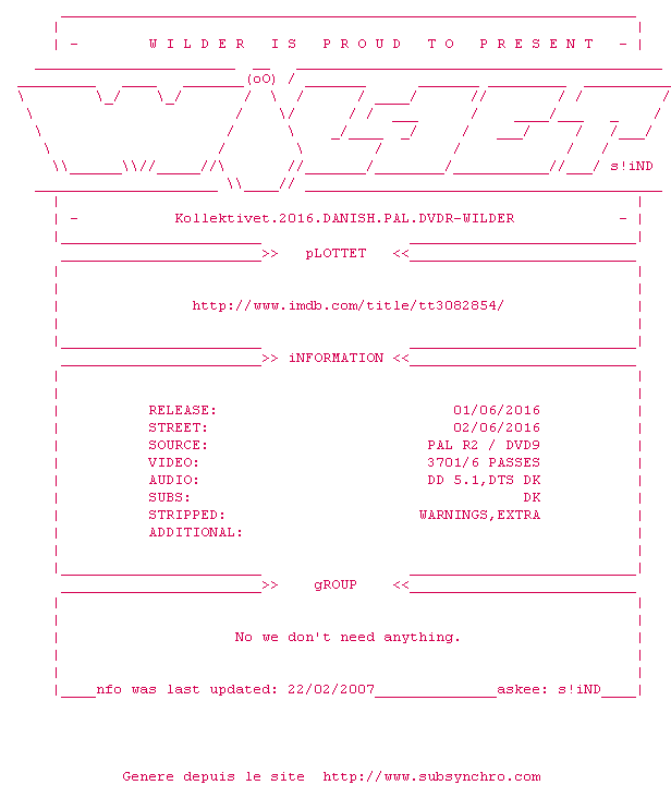 Voir le nfo de la release Kollektivet.2016.DANISH.PAL.DVDR-WILDER