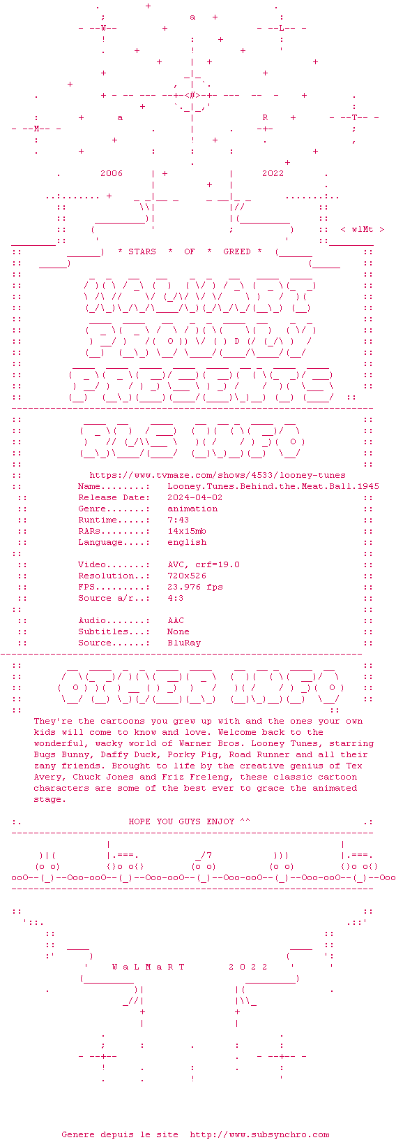 Voir le nfo de la release Looney.Tunes.Behind.The.Meat.Ball.1945.BDRip.x264-WaLMaRT