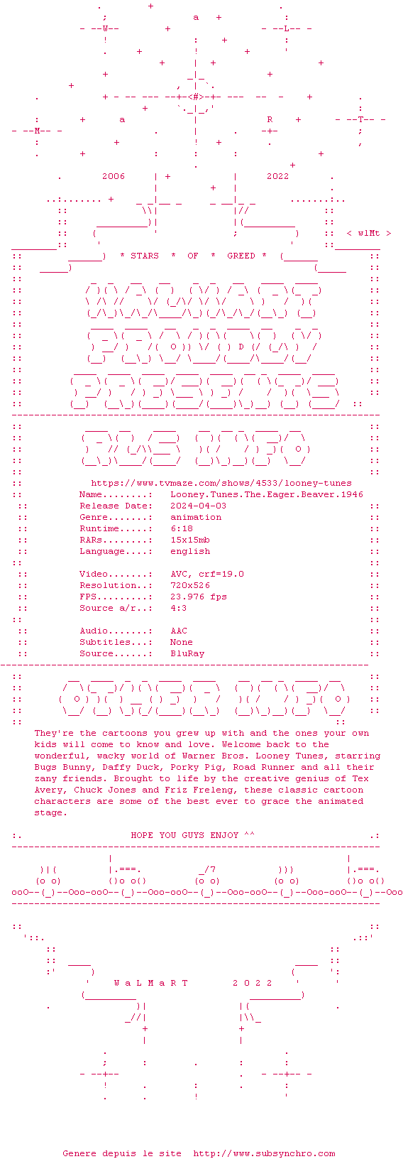 Voir le nfo de la release Looney.Tunes.The.Eager.Beaver.1946.BDRip.x264-WaLMaRT