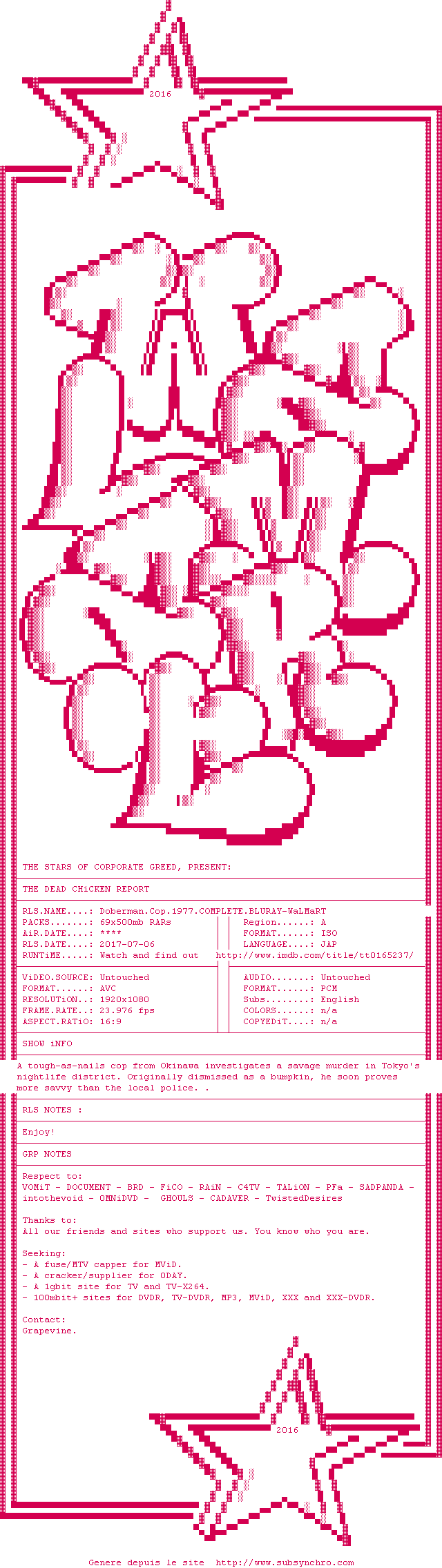 Voir le nfo de la release Doberman.Cop.1977.COMPLETE.BLURAY-WaLMaRT