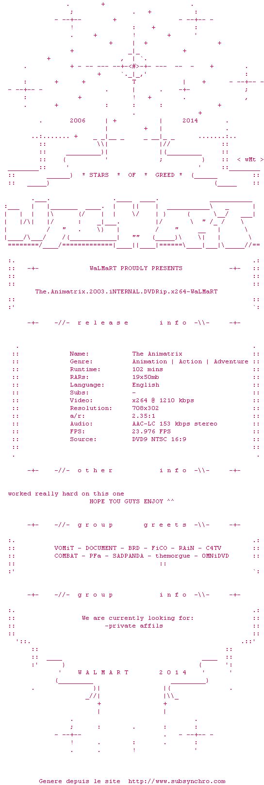 Voir le nfo de la release Street.Fighter.II.The.Animated.Movie.1994.DUBBED.NTSC.DVD9-WaLMaRT