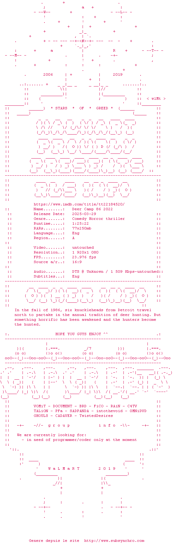 Voir le nfo de la release Deer.Camp.86.2022.COMPLETE.BluRay-WaLMaRT