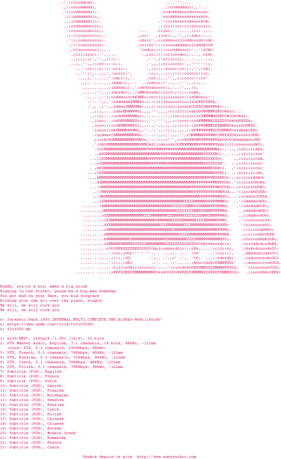 Voir le nfo de la release Jurassic.Park.II.The.Lost.World.1997.iNTERNAL.MULTI.COMPLETE.UHD.BLURAY-WeWillRockU