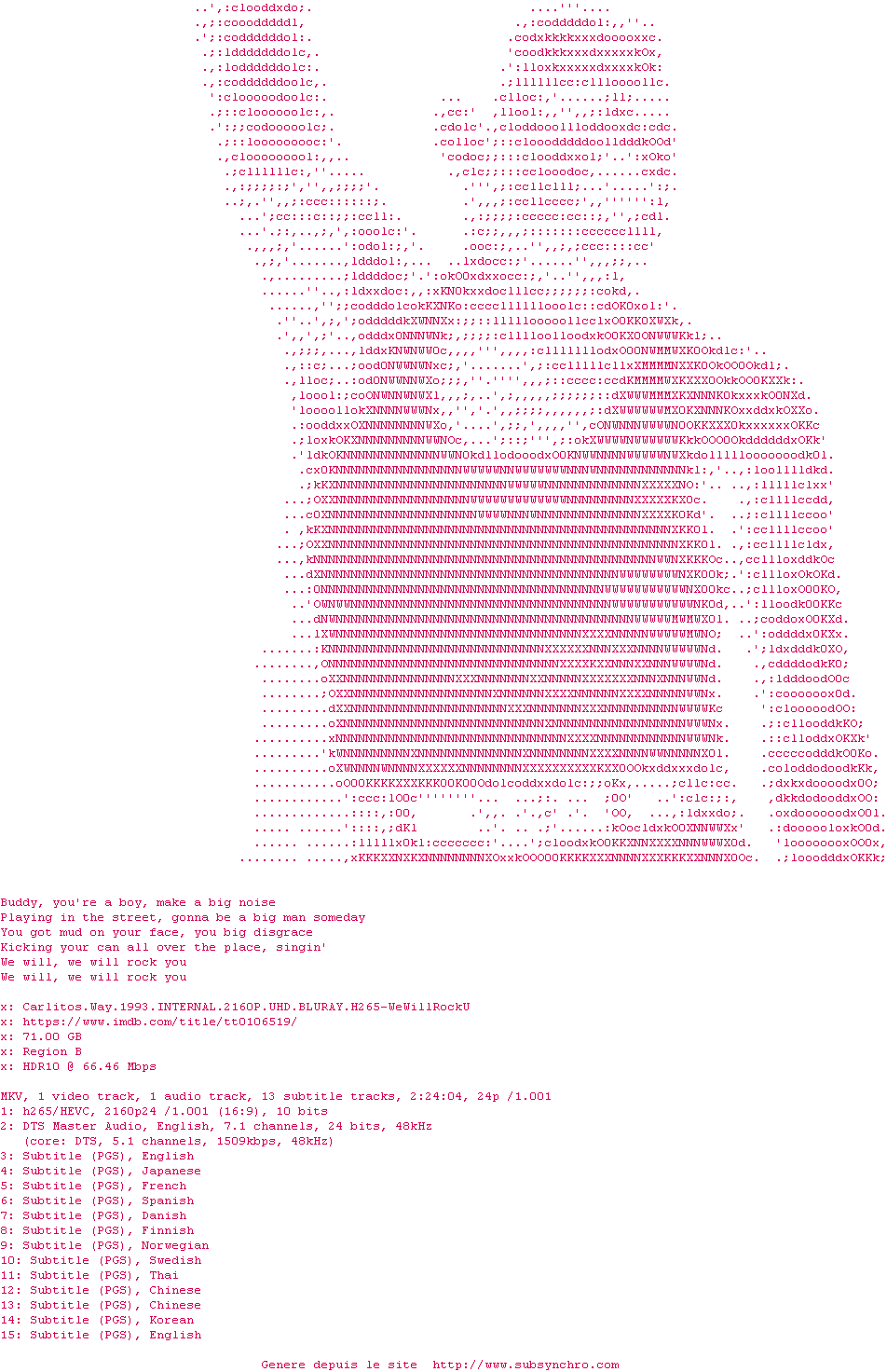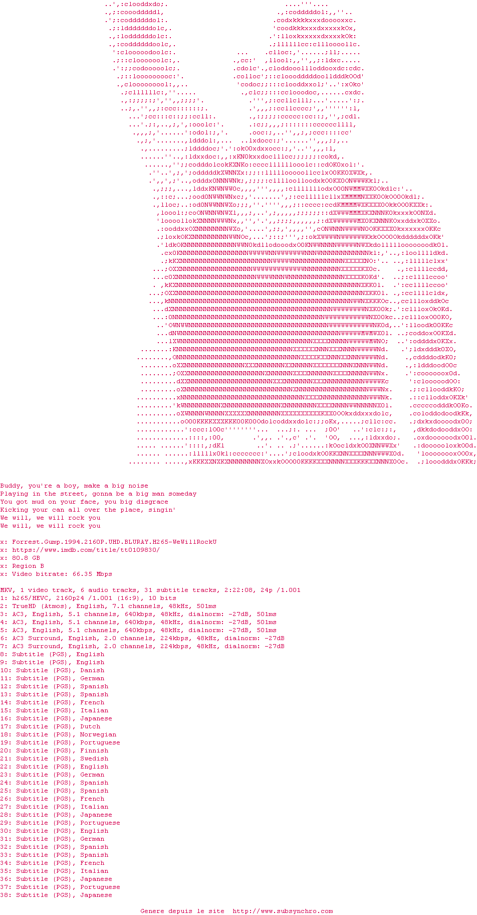 Voir le nfo de la release Forrest.Gump.1994.2160P.UHD.BLURAY.H265-WeWillRockU