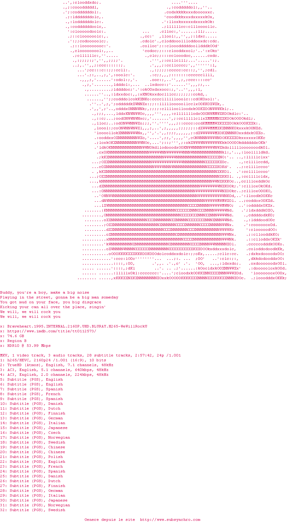 La release Braveheart.1995.iNTERNAL.MULTI.COMPLETE.UHD.BLURAY-WeWillRockU est en 4K