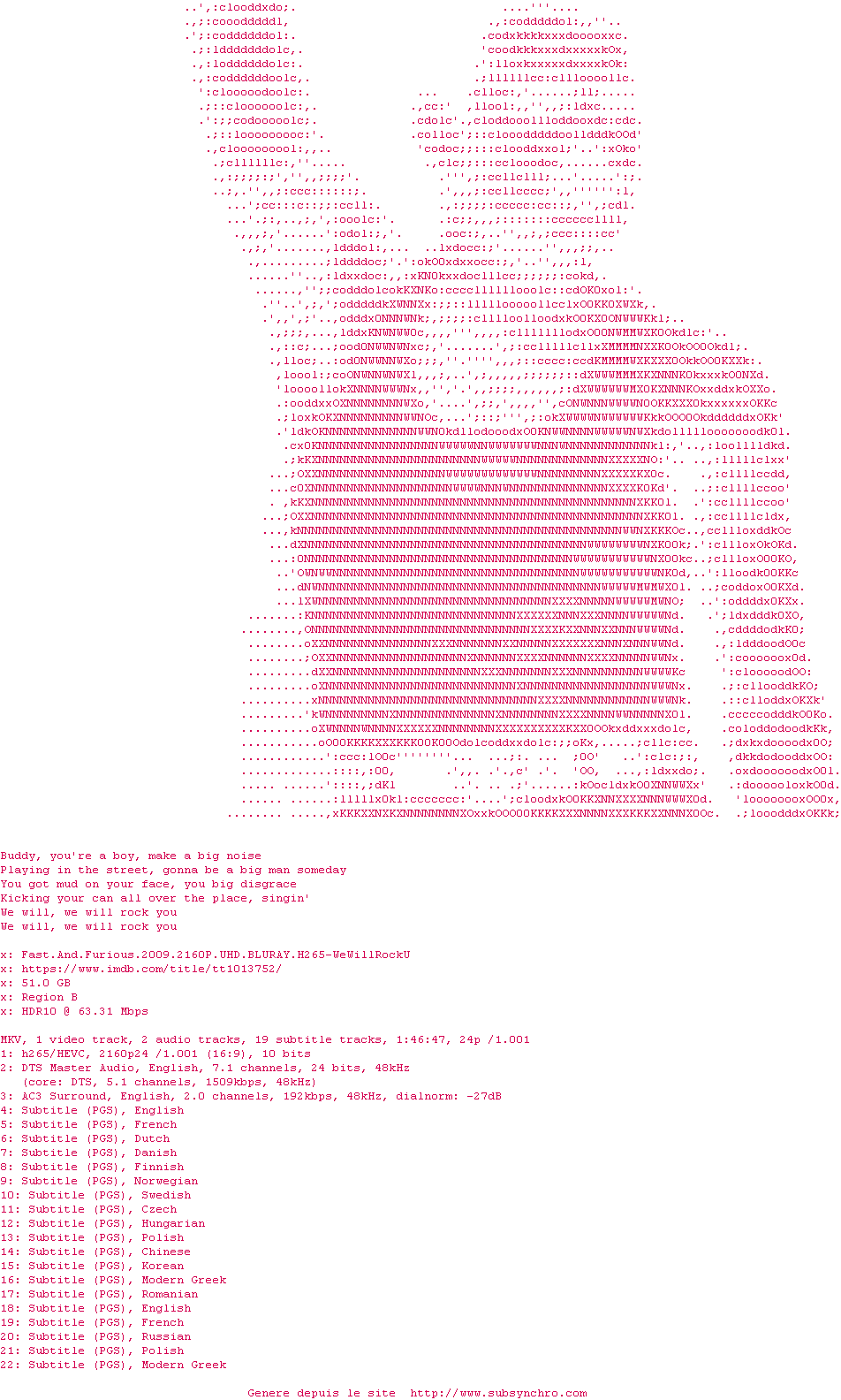 Voir le nfo de la release Fast.And.Furious.2009.2160P.UHD.BLURAY.H265-WeWillRockU