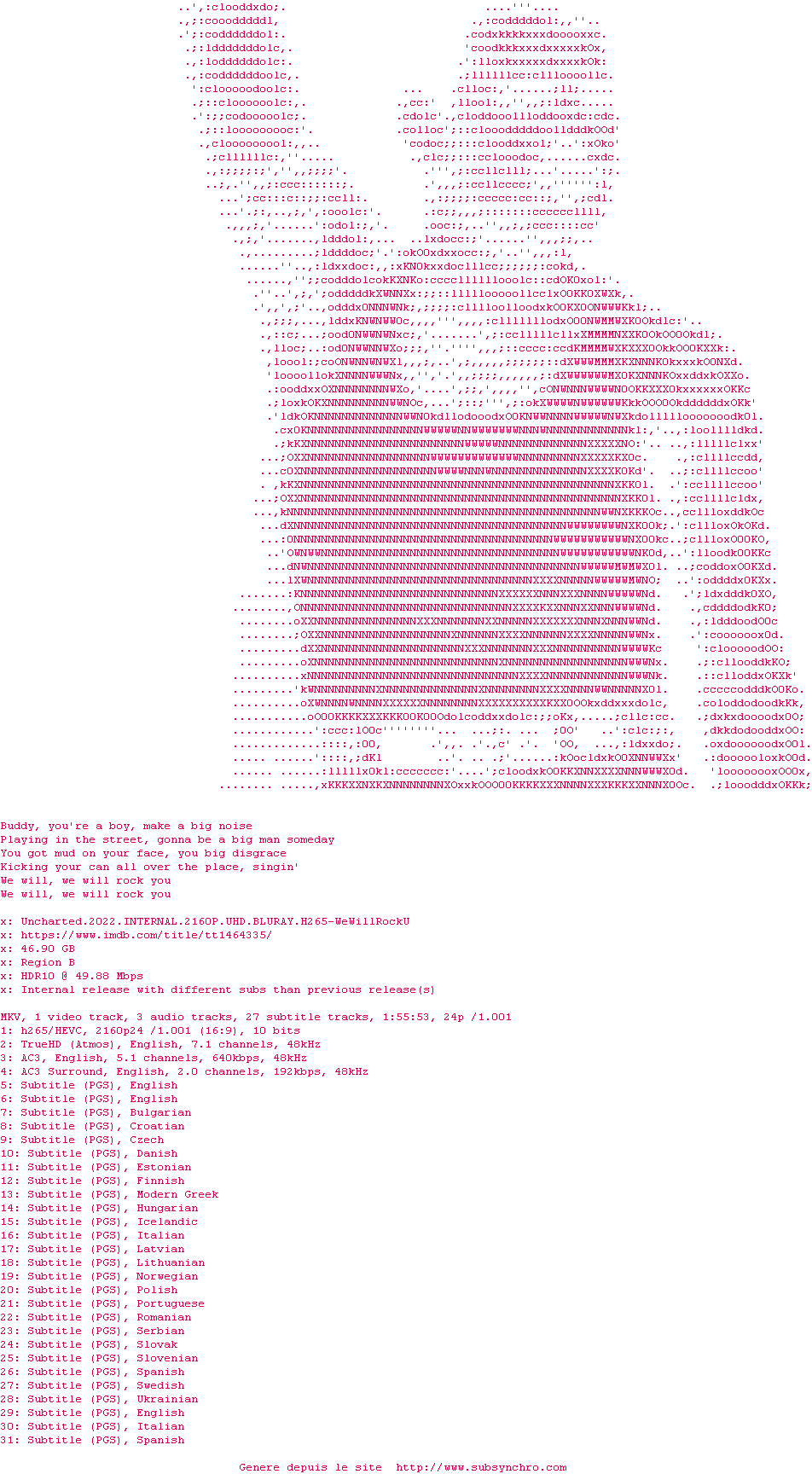 La release Uncharted.2022.MULTI.COMPLETE.UHD.BLURAY-WeWillRockU est en 4K