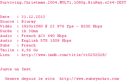Voir le nfo de la release Surviving.Christmas.2004.MULTi.1080p.BluRay.x264-ZEST