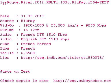 Voir le nfo de la release Rogue.River.2012.MULTi.108p.BluRay.x264-ZEST