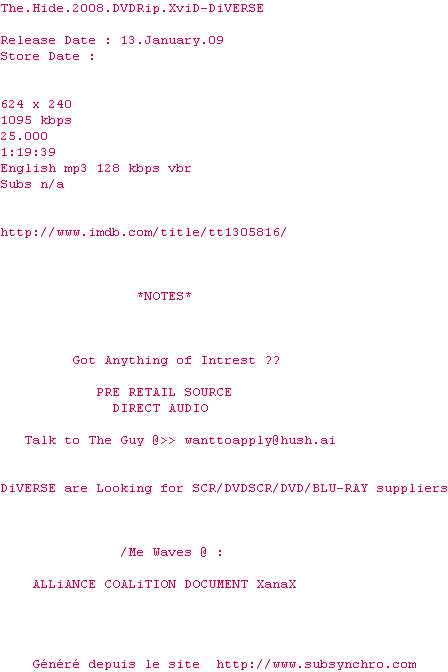 Voir le nfo de la release The.Hide.2008.DVDRip.XviD-DiVERSE