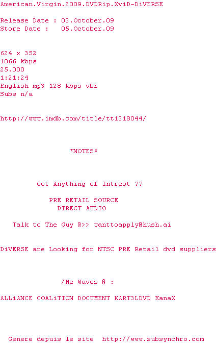 Voir le nfo de la release American.Virgin.2009.DVDRip.XviD-DiVERSE