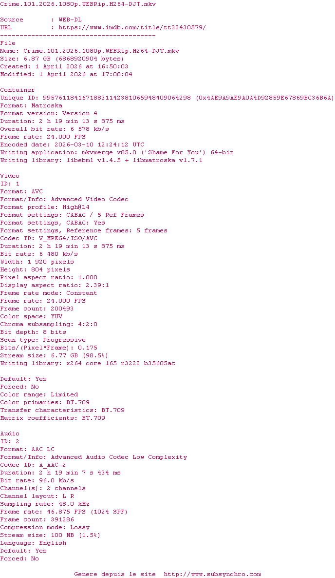 Voir le nfo de la release Crime.101.2026.1080p.WEBRip.H264-DJT