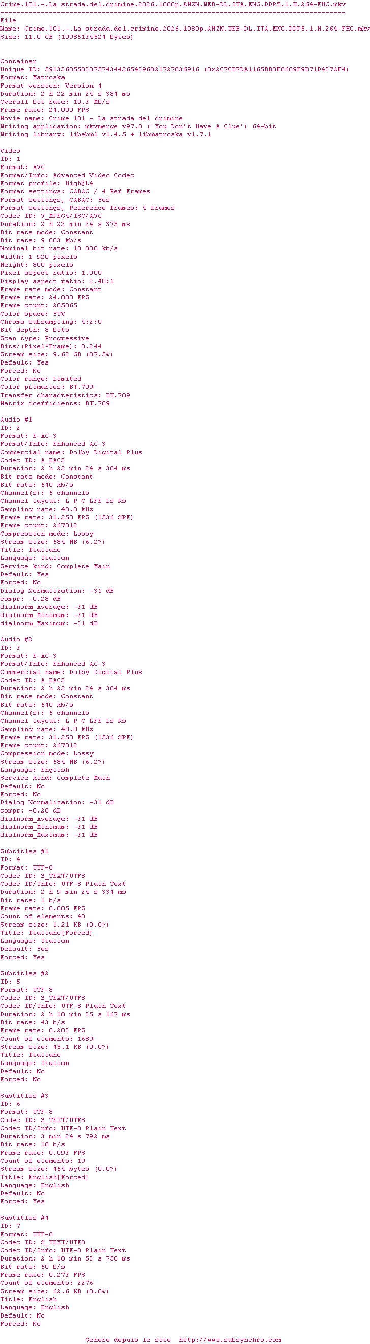 Voir le nfo de la release Crime.101.La.Strada.Del.Crimine.2026.1080p.AMZN.WEB-DL.ITA.ENG.DDP5.1.H.264-FHC