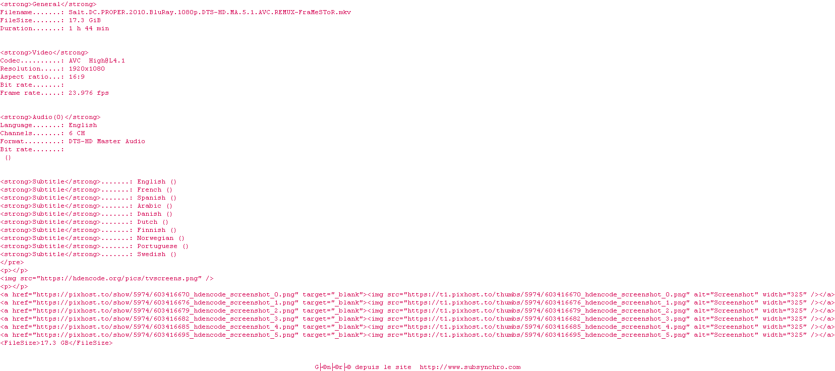 Voir le nfo de la release Salt.DC.PROPER.2010.BluRay.1080p.DTS-HD.MA.5.1.AVC.REMUX-FraMeSToR