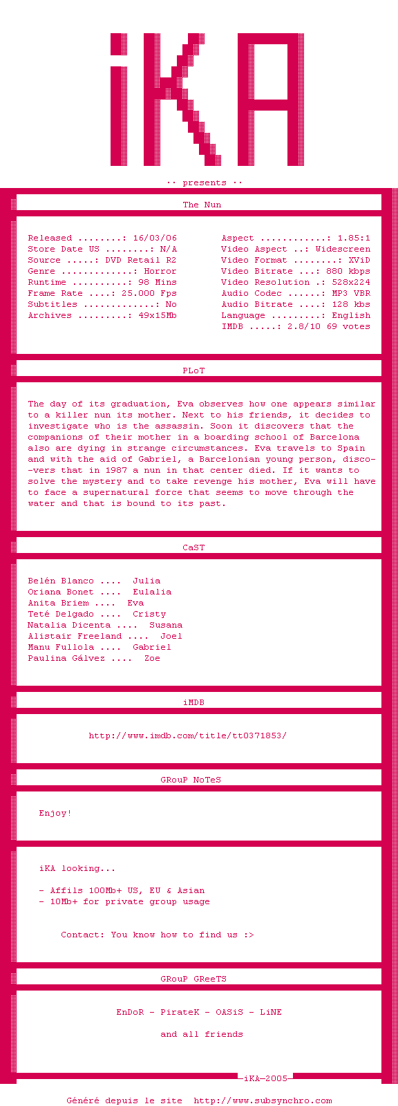 Voir le nfo de la release The.Nun.2005.LiMiTED.DVDRiP.XViD-iKA