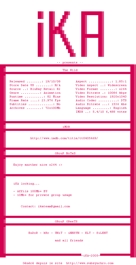 Voir le nfo de la release The.Wild.2006.1080p.BluRay.x264-iKA