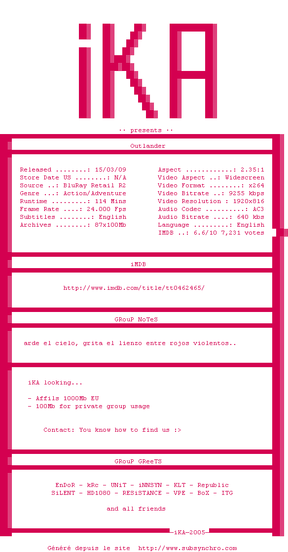 Voir le nfo de la release Outlander.2008.1080p.BluRay.x264-iKA