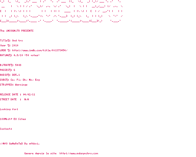 Voir le nfo de la release Ond.Tro.2010.SWEDISH.PAL.DVDR-iNCOGNiTO