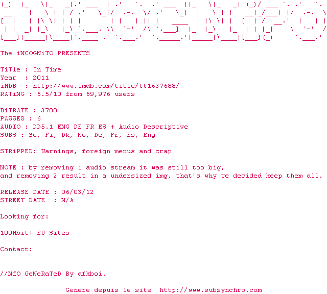 Voir le nfo de la release In.Time.2011.MULTi.PAL.DVDR-iNCOGNiTO
