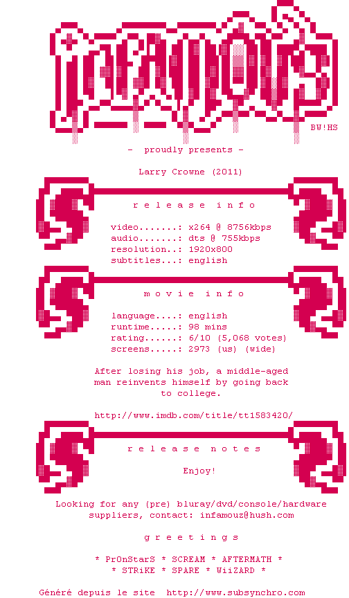 Voir le nfo de la release Larry.Crowne.2011.1080p.BluRay.x264-iNFAMOUS